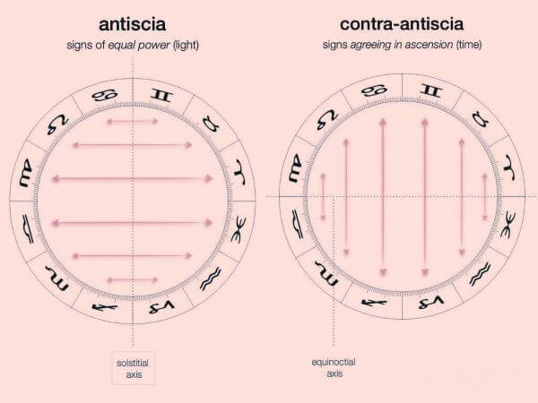 Antiscia are mirror points of the planets in relation to the X-axis or the axis of the winter solstice (0° Cancer – 0° Capricorn) .