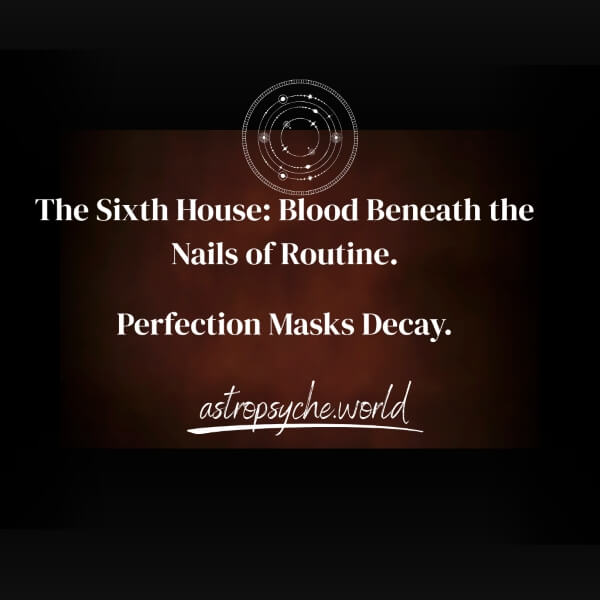 Jung would say that the sixth house is where the shadow daily seeps into our life. What we reject within ourselves – weakness, powerlessness, illness, dependence on others – in the sixth house takes the form of obsessive control, rituals, habits, routine. Order as neurosis. Hygiene as exorcism. Work as punishment.